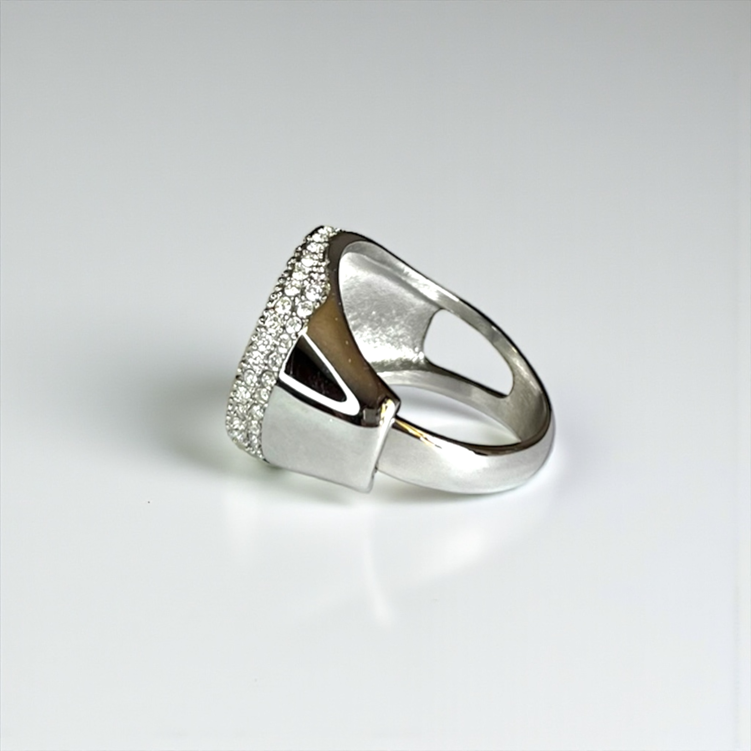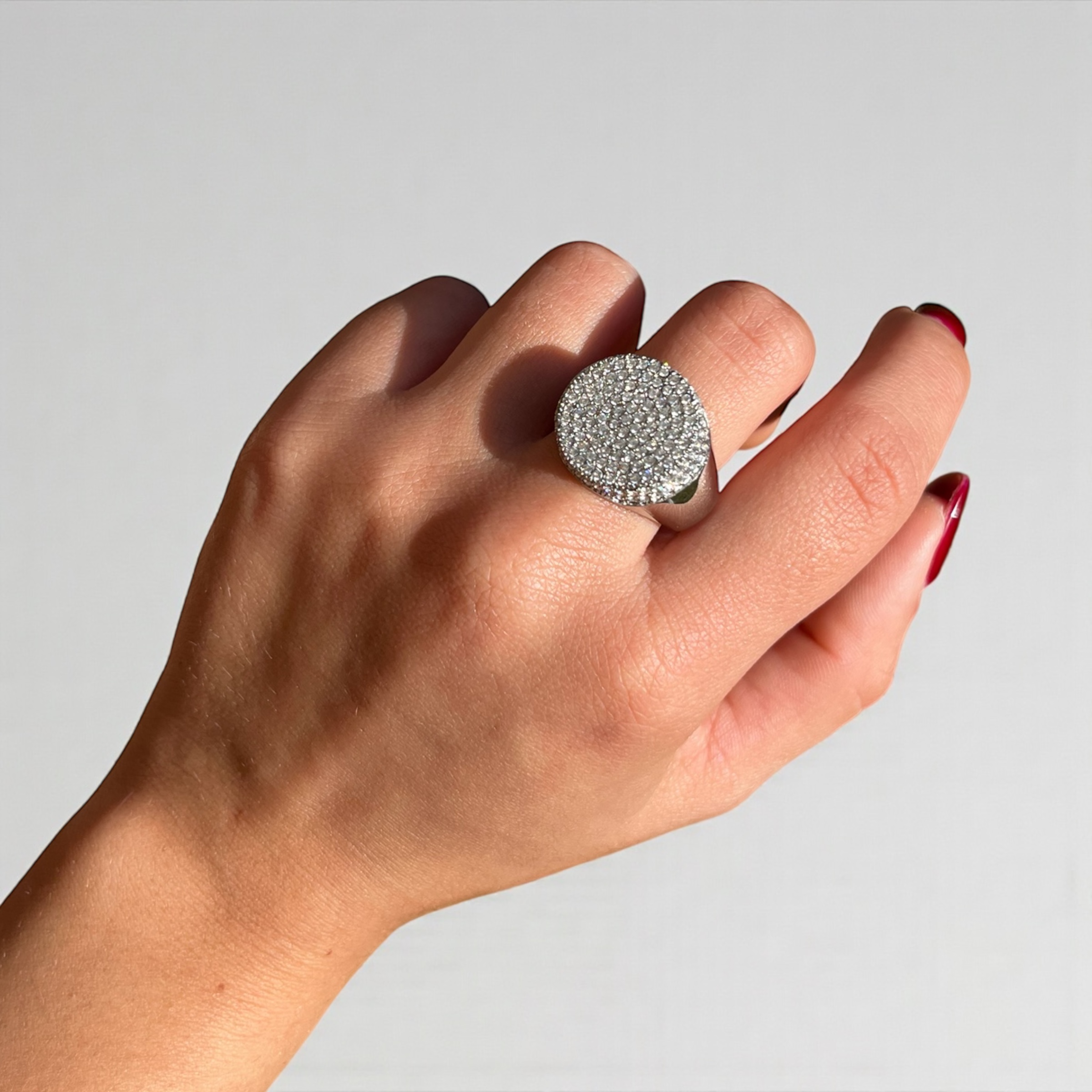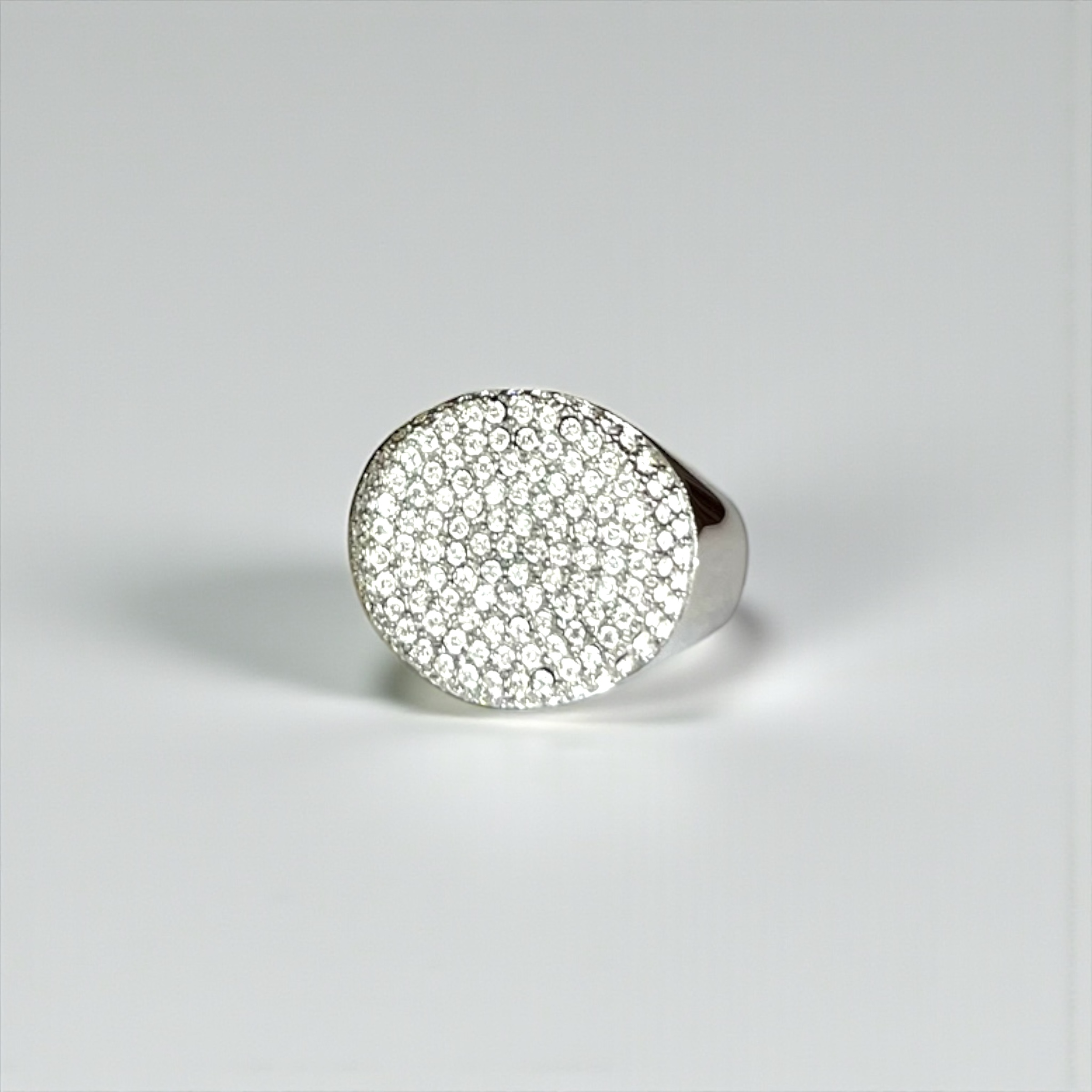 La superficie pavé, interamente ricoperta di zirconi bianchi, sprigiona una luminosità decisa, mentre il design regolabile abbraccia la mano con naturale eleganza, adattandosi a te come una seconda pelle.