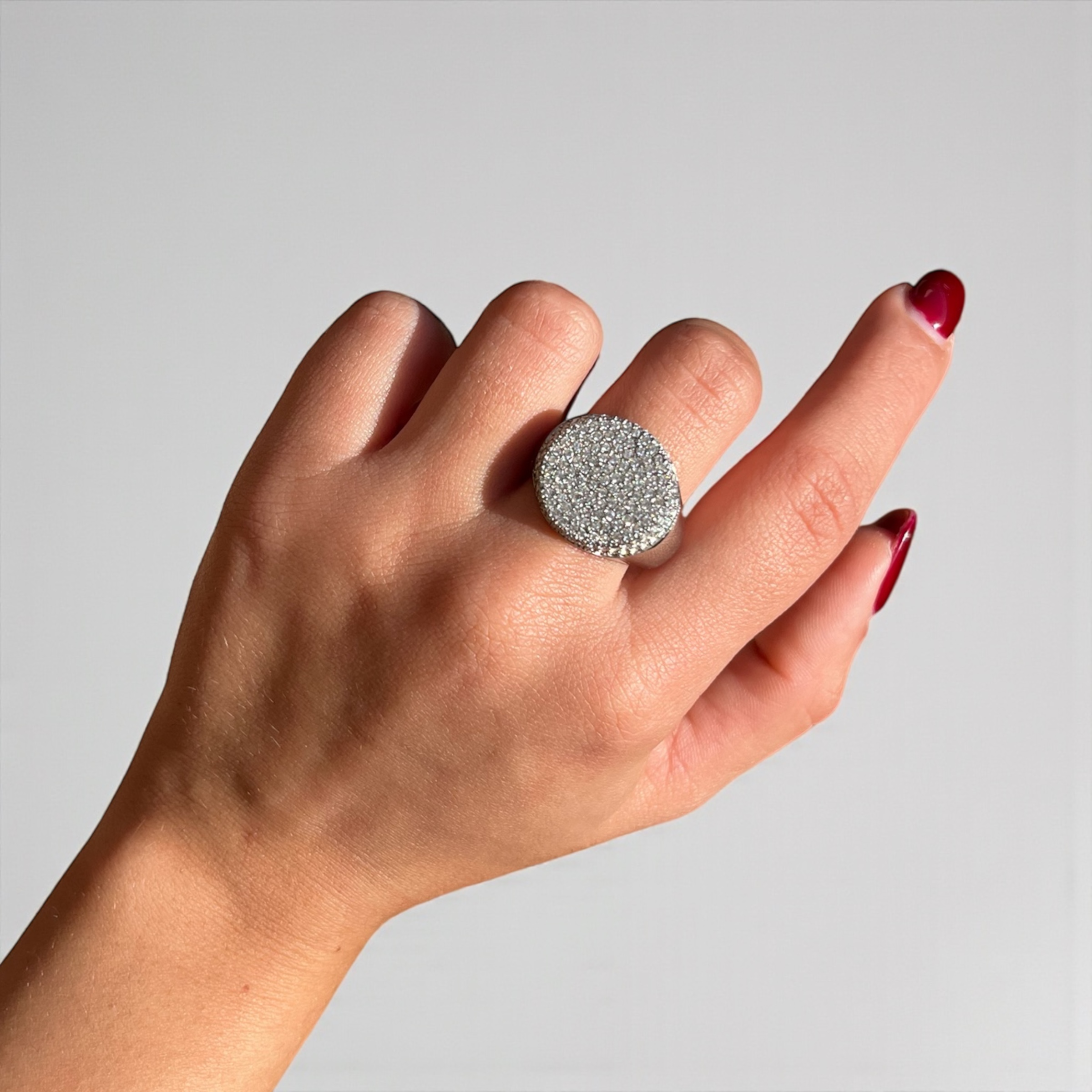 Anello regolabile in acciaio inossidabile 316L, anallergico e resistente, con pavé tondo di zirconi bianchi che riflettono la luce con intensità e raffinatezza.