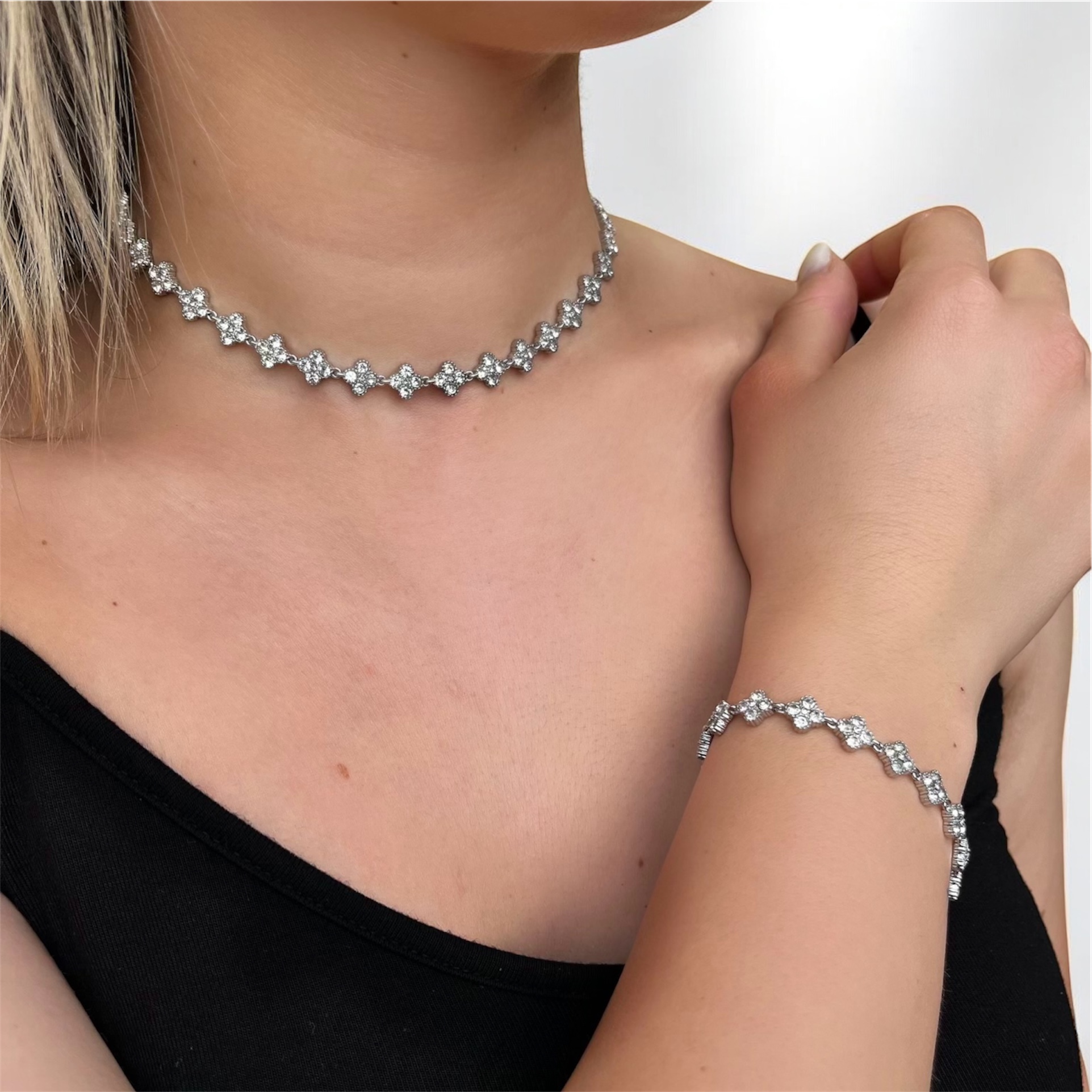 Bracciale floreale in acciaio 316L con zirconi. Luminoso, raffinato, anallergico. Un tocco deciso di femminilità.
