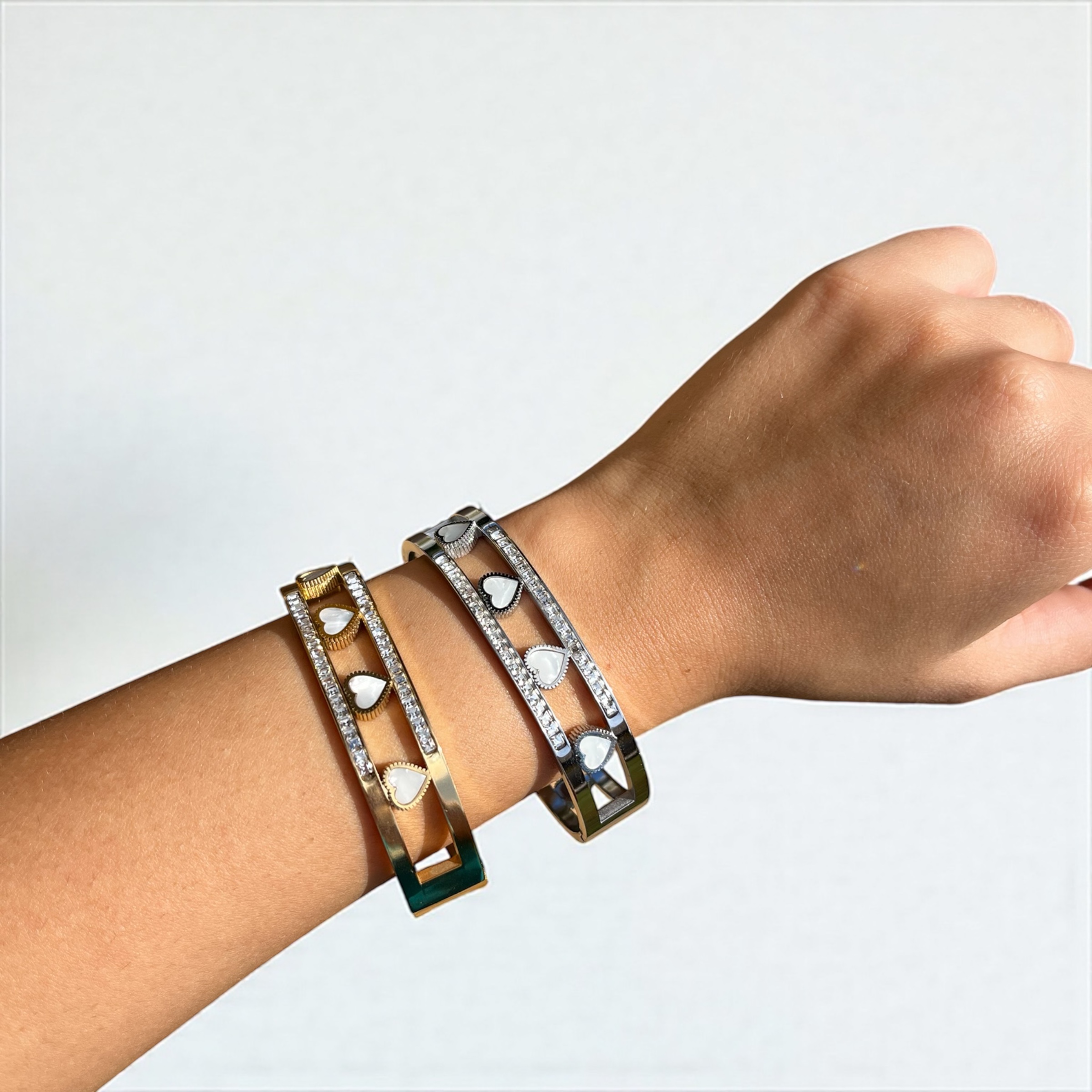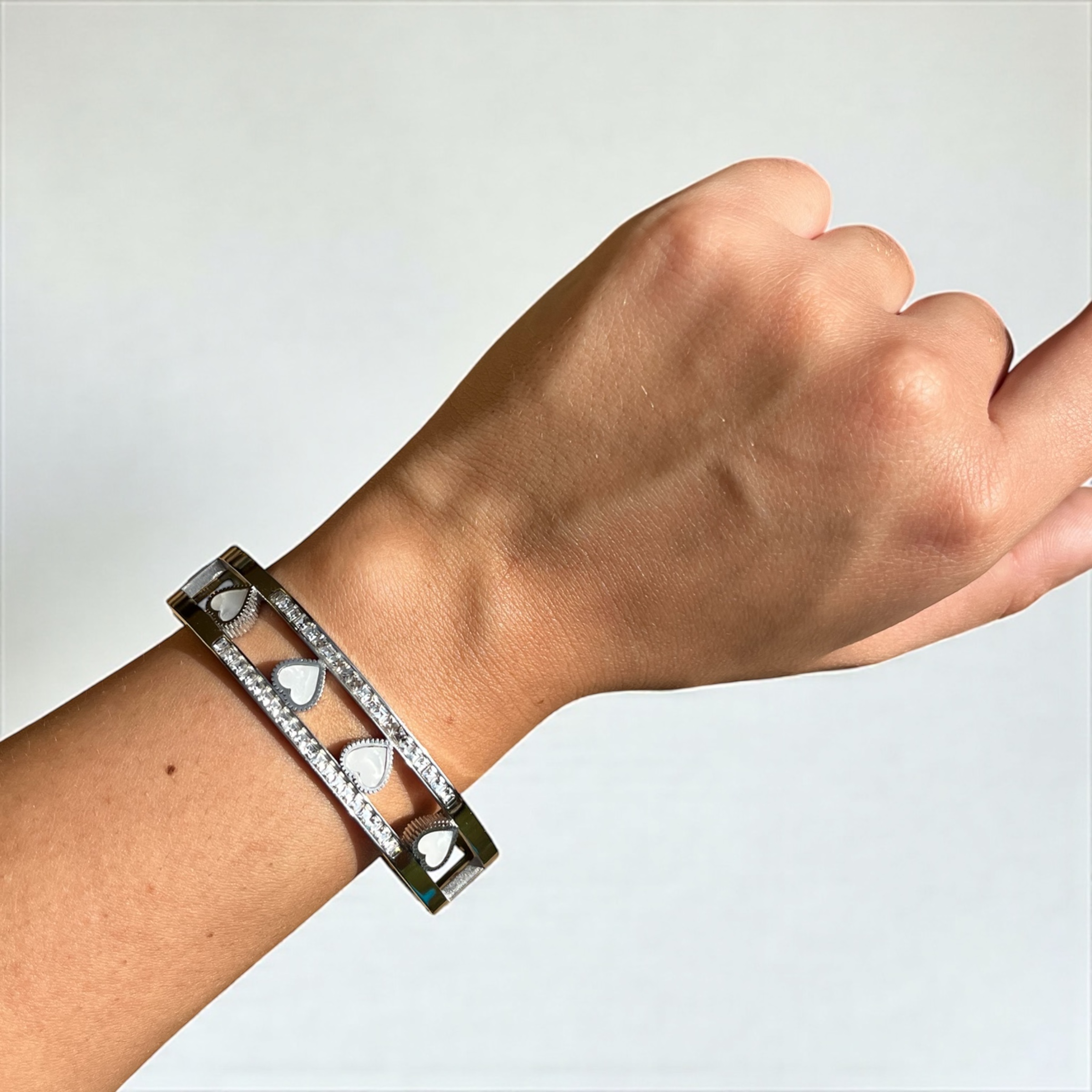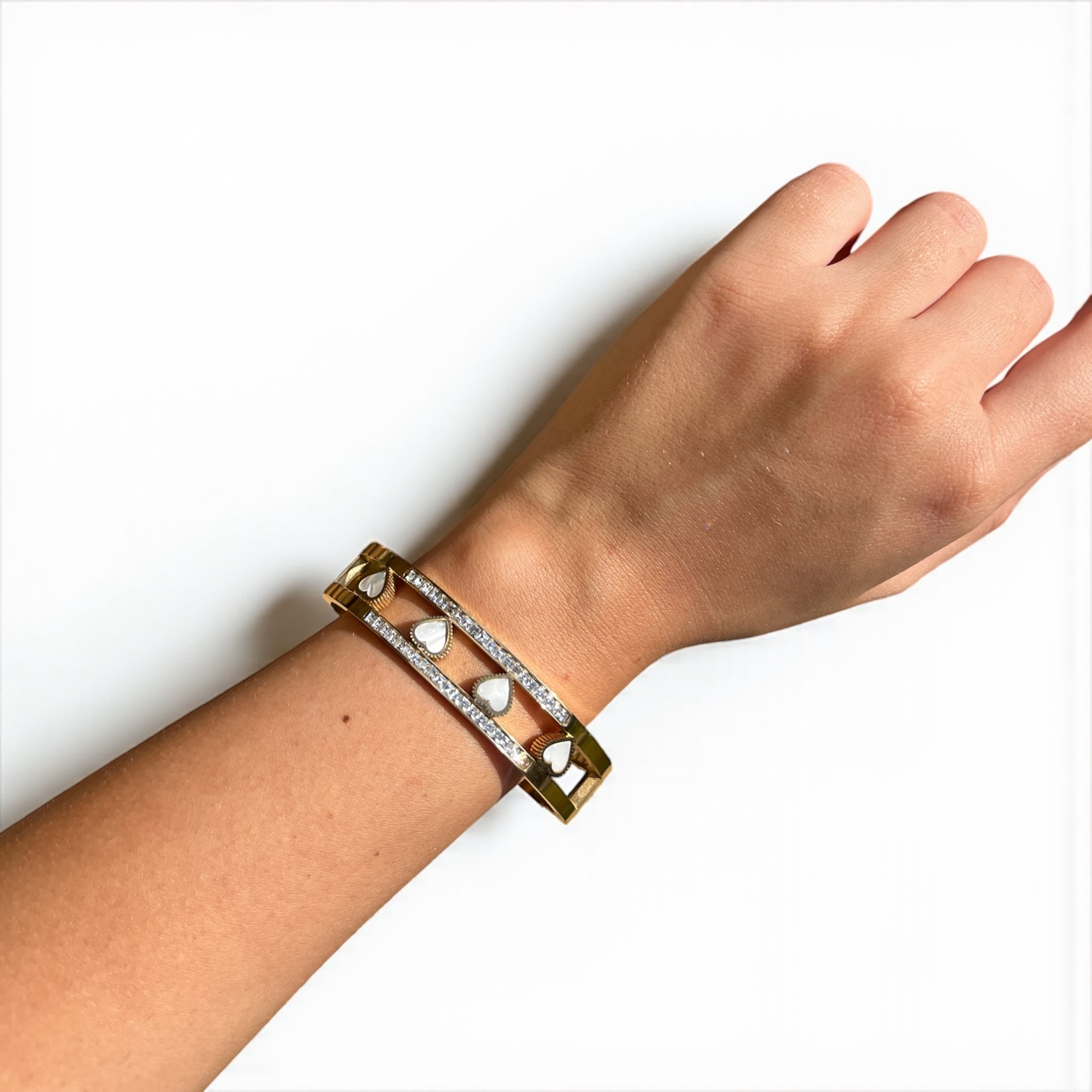 Bracciale rigido in acciaio 316L ipoallergenico con 4 cuori in madreperla e zirconi bianchi. Un design che celebra l’unione e l’affetto, disponibile in finitura Gold o Silver.