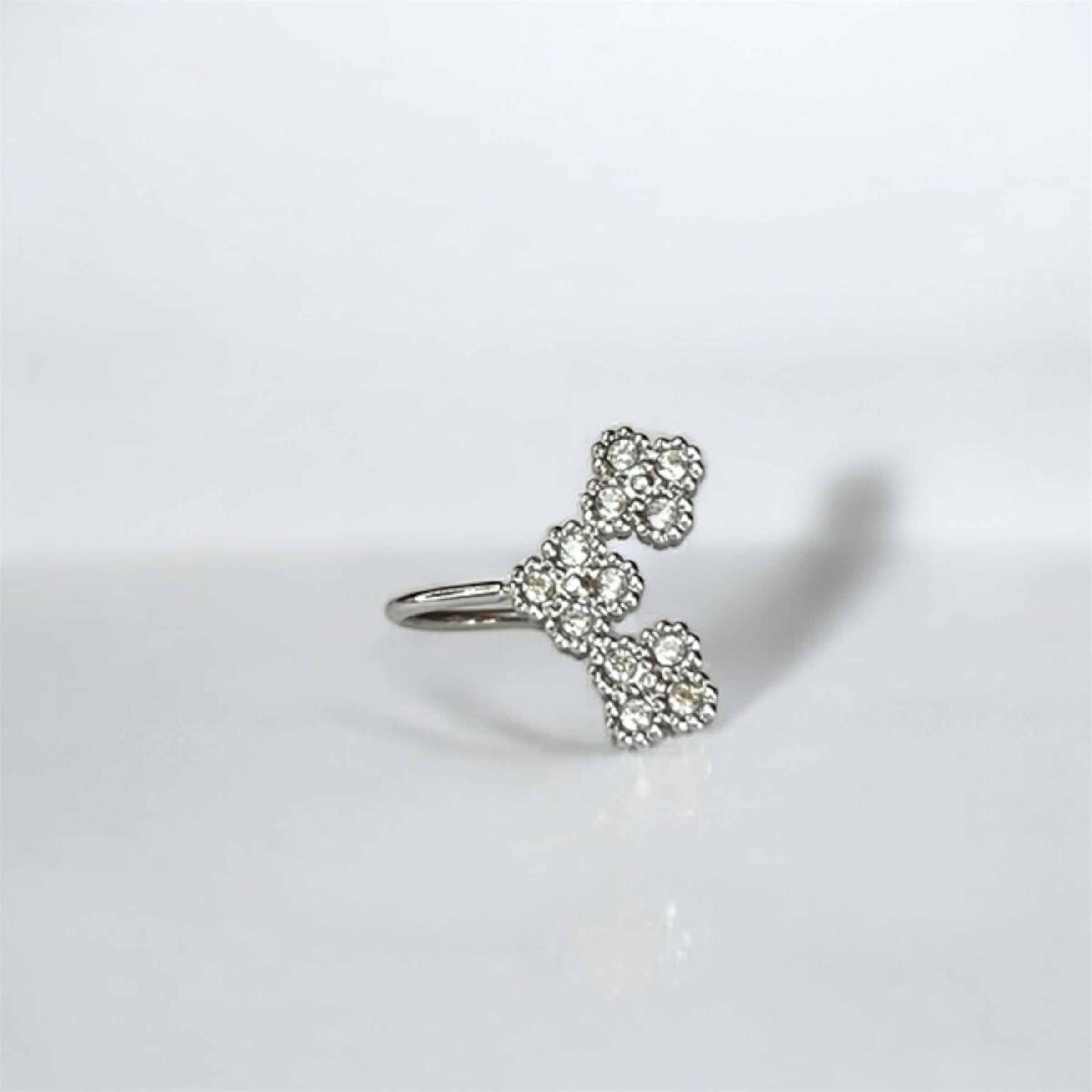 Il suo design raffinato è composto da tre fiori, ognuno con quattro petali impreziositi da zirconi bianchi, capaci di catturare ogni riflesso con estrema brillantezza.