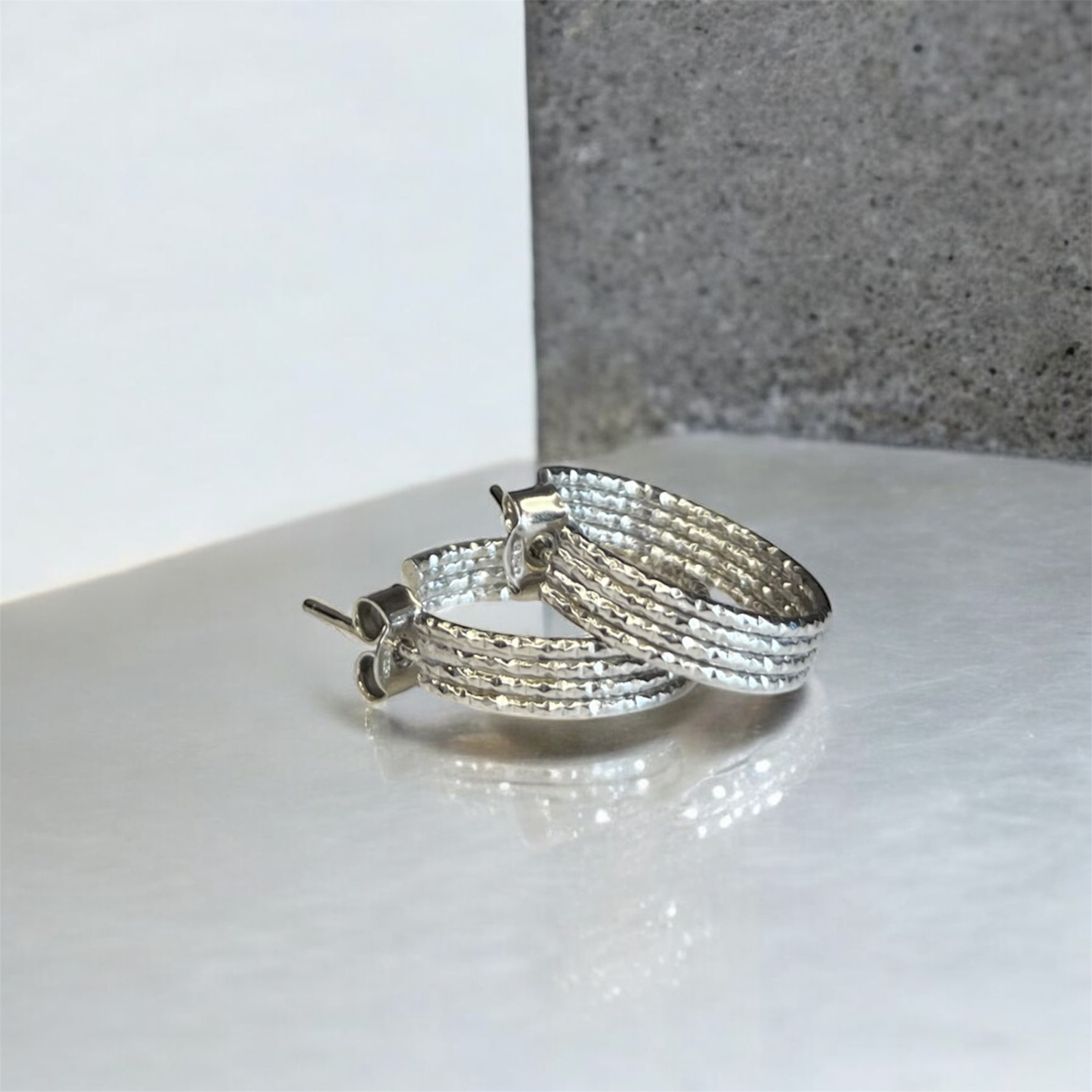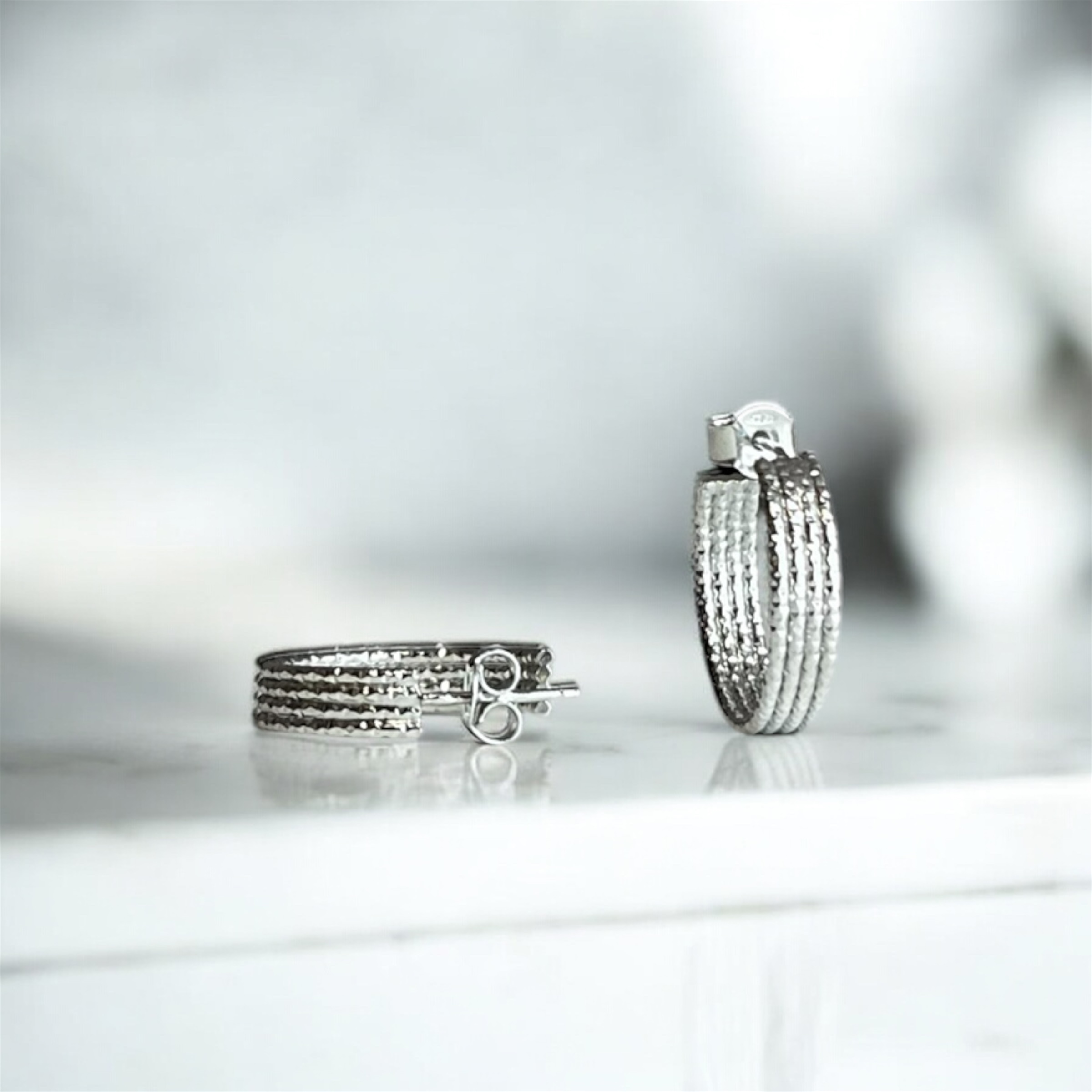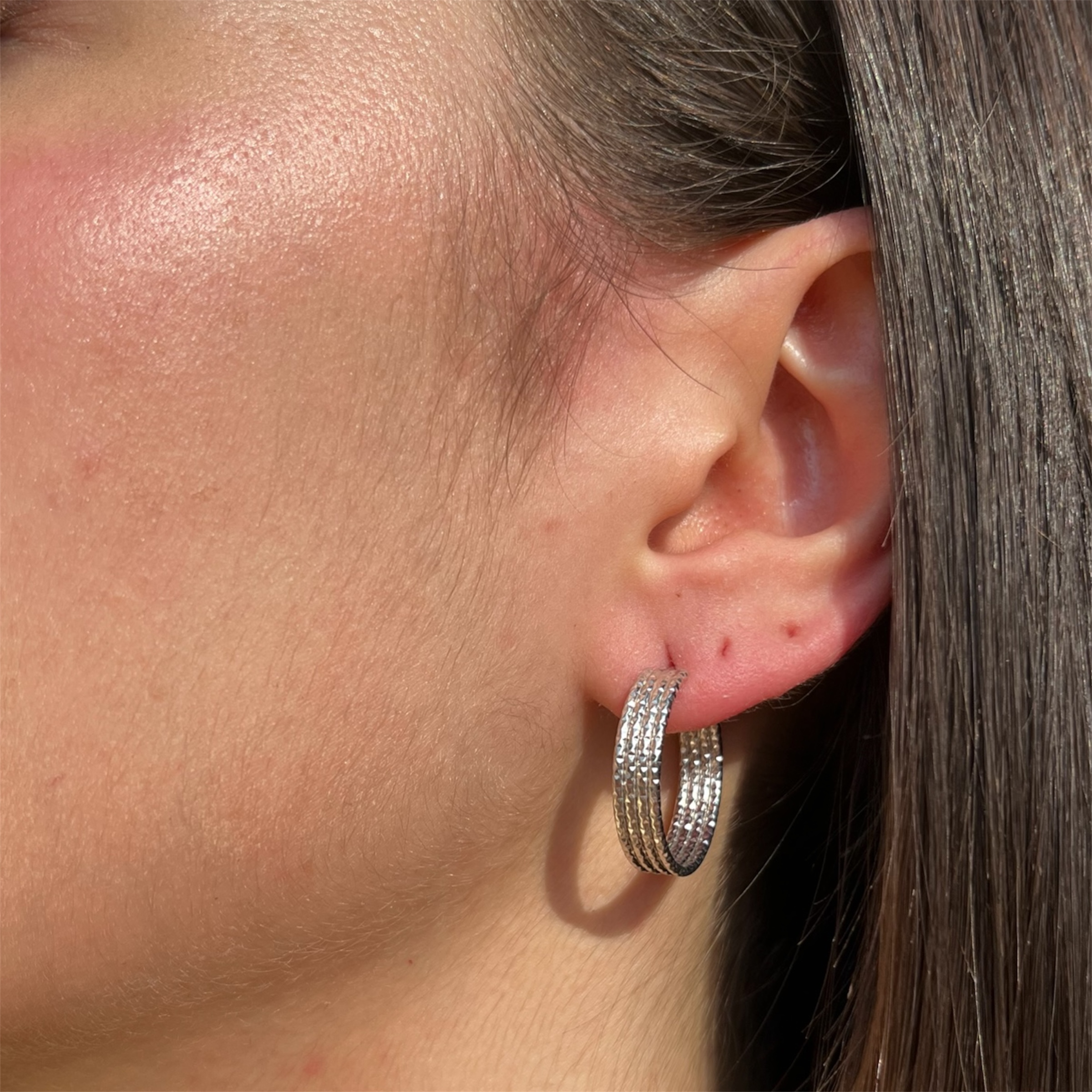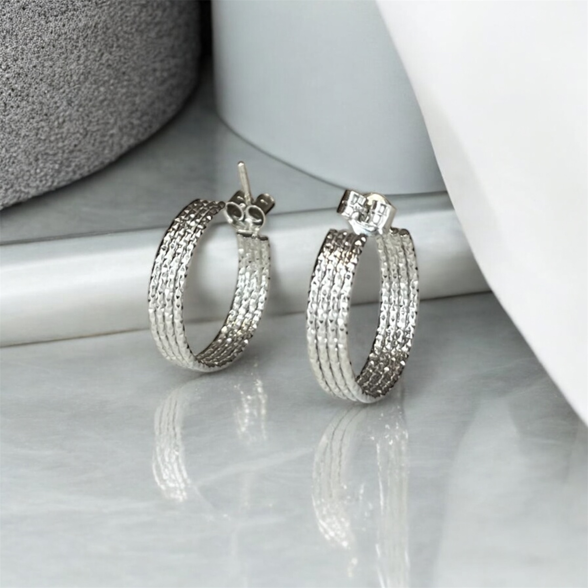 Orecchini tondi in Argento 925 con finitura diamantata e rodiata. Eleganza visibile, essenziale, senza tempo.